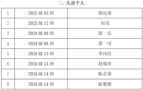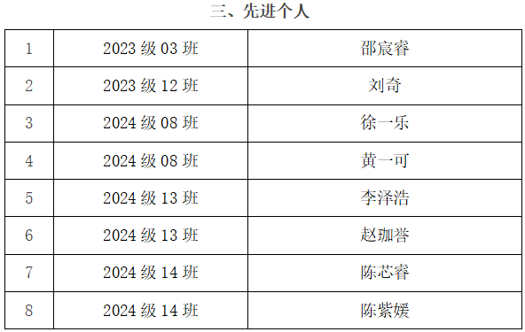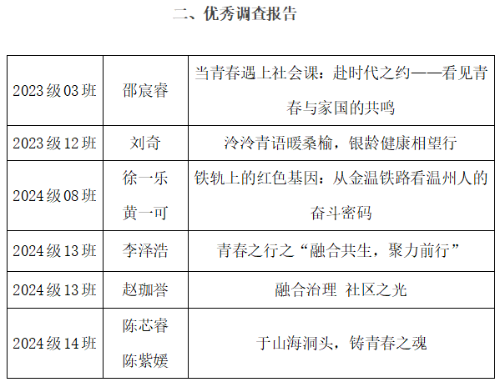 2025年暑假,我校开展了暑期社会实践活动。活动开展以来,各班积极响应、踊跃参加,在活动中更是涌现了一大批优秀的暑期社会实践团队和个人。经由各班级推荐、校团委审核,共评选出2023级03班等16支优秀团队,2024级13班《融合治理 社区之光》等6份优秀调查报告,邵宸睿等8名先进个人,现予以表彰。
