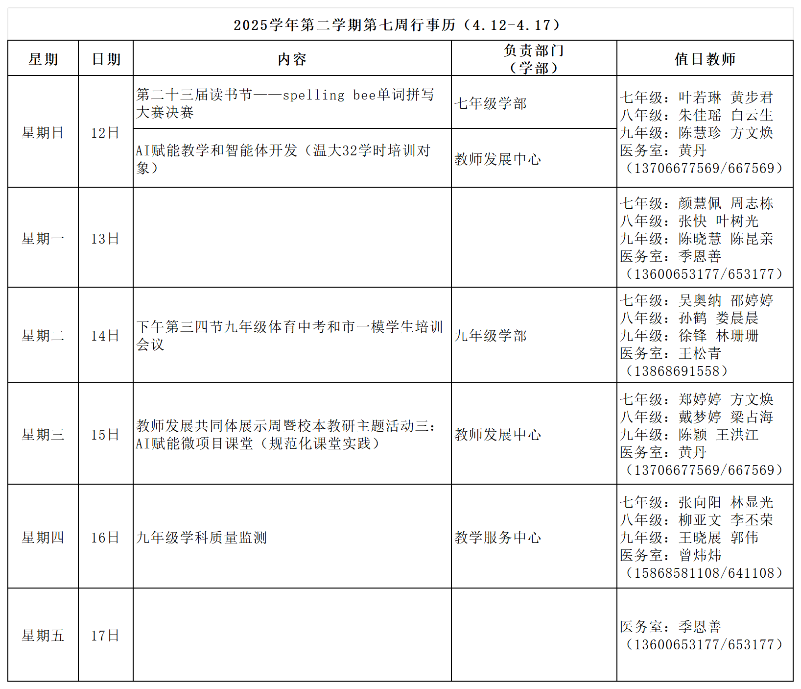 2025学年第二学期第七周行事历(4.12-4.17) 作者: 发布时间:2026-04-10 浏览量: